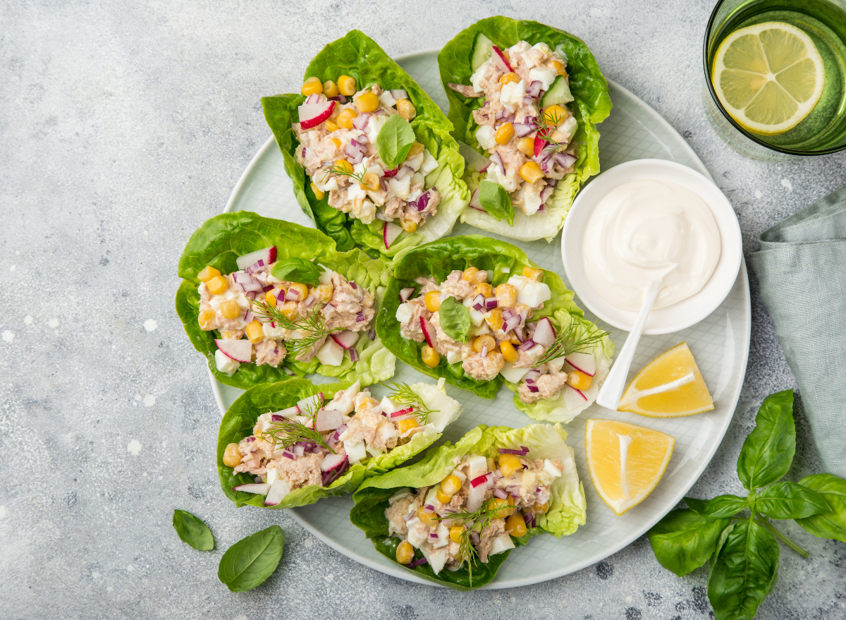 Not only is tuna a protein-rich food, but it also packs essential fats, like omega-3. A 3.7-ounce portion of tuna contains 91 calories and a whopping 20 grams of protein. For a 100-calorie homemade tuna salad, mix your tuna with chopped vegetables, like bell pepper and cucumber, seasonings of choice, and mustard. Serve in large lettuce leaves for a nutritious and filling snack.