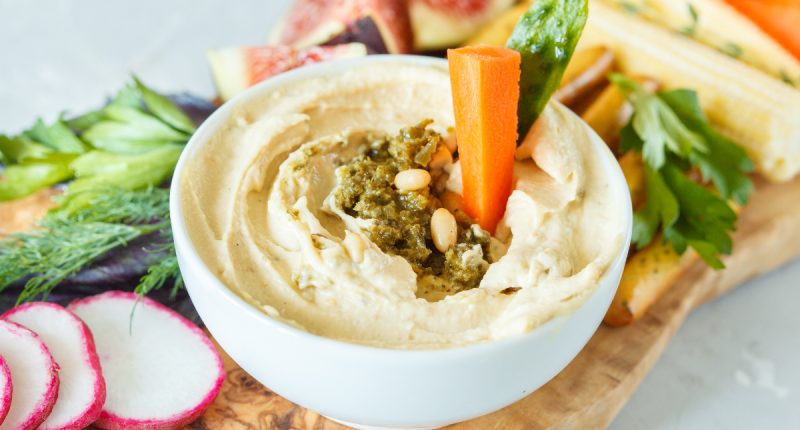 “Hummus is made with chickpeas, making this a filling snack due to the fiber content in chickpeas,” Young says. “In addition, using vegetables to dip into the hummus adds more volume to the snack without increasing the number of calories. Moreover, studies have proven that soluble fiber found in vegetables plays a significant role in belly fat loss.”