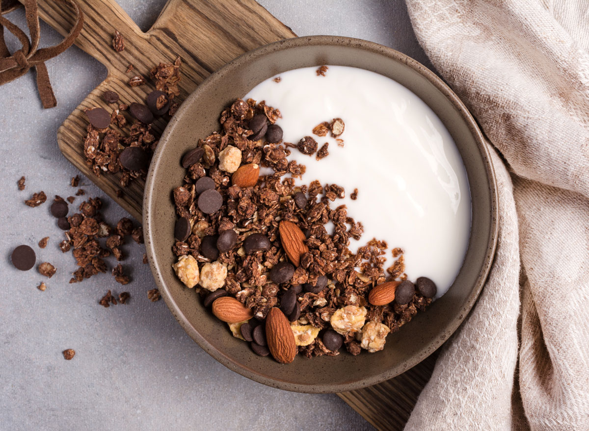 This chocolate cashew butter granola from Bear Naked is crafted with four different types of sugar. You’ll get 11 grams of sugar in a small half-cup serving, plus 3 grams of saturated fat, which comes out to 15% of your daily value. If you’re craving the nut butter-chocolate combo, sprinkle a tablespoon of cacao nibs and drizzle a tablespoon of cashew butter (or peanut butter) over plain Greek yogurt.