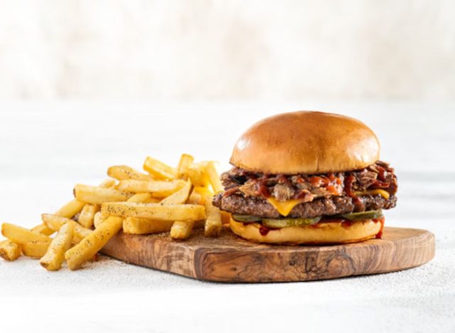 Just consider the extra meaty Bacon Rancher Burger, which comes with two beef patties, ranch, American cheese, sautéed onions, pickles, and a whopping six slices of bacon. Among the rest of the chain’s burger menu, you’ll find other notable options topped with piles of sautéed mushrooms, jalapeños, and even pulled brisket.