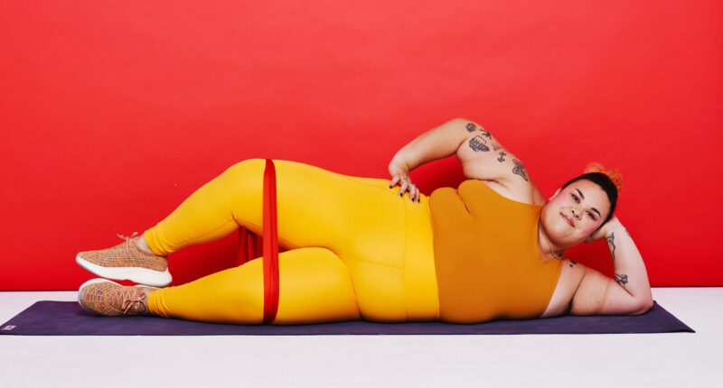 Now, you may notice a lot of common hip abductor moves use mini-bands or resistance bands. That’s because these portable tools are easy ways to add external resistance to an exercise, which makes it more challenging than bodyweight alone, says Fagin. Many banded moves can also be done with a cable machine or ankle weights, but for lots of folks a mini-band or resistance band is the most accessible option for progressing it. That said, if you’re just getting started, it’s smart to do the movements with just bodyweight at first. Then, once you’ve mastered proper form, you can progress by added resistance or weights.