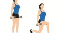To perform dumbbell lunges, begin by standing upright with a dumbbell in each hand, arms fully extended at your sides, and palms facing your torso. Take a step forward with your right foot, keeping your torso upright and maintaining balance. As you plant your right foot, rotate your left foot inward slightly. Lower your body by flexing the knee and hip of your front leg until the knee of your rear leg is almost in contact with the floor. Ensure you’re pushing through the full foot of your front leg. Push through the full foot of your front leg, extending your hip and knee to return to the standing position. Repeat for the target repetitions, and then switch legs.