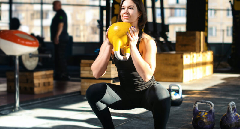 To set up for goblet squats, plant your feet hip or shoulder-width apart; your toes should point straight ahead of you. Hold a single dumbbell or kettlebell like a goblet up by your chest. Descend into a squat until your thighs are parallel to the ground. Press through both feet and squeeze your buttocks as you rise back up to standing. Perform three sets of 12 to 15 reps.