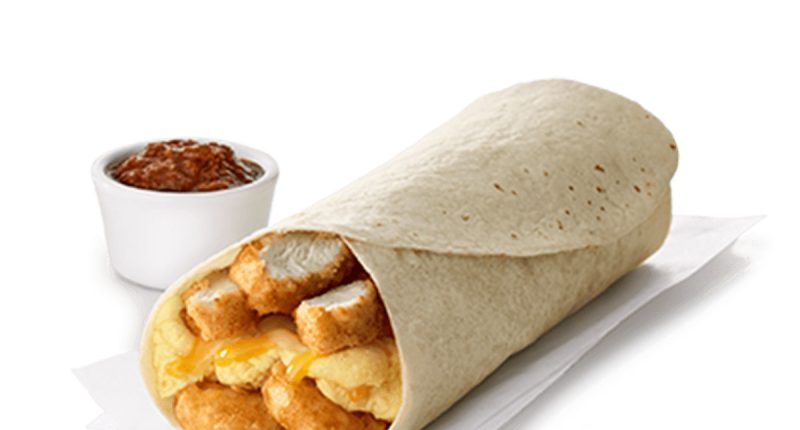 The Hash Brown Scramble Burrito comes with nuggets, scrambled eggs, hashbrowns, and cheese, all adding a significant amount of fat and sodium.