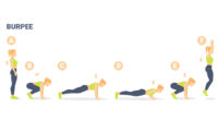 Begin in a squat position with your feet shoulder-width apart. Lower yourself into a deep squat, then explosively jump up, extending your arms overhead. Land softly into the squat position, and repeat for four sets of 10 to 12 reps.