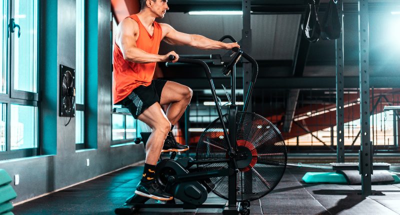 An Airdyne bike is a machine where you can use both your legs and arms to push against resistance. This gives a total-body cardio workout, which will smoke your body and your lungs for tremendous fat loss. (Trust us.) You can do it slow and steady for a longer duration (20 to 30 minutes) or you can go all-out for 15 to 30 seconds and catch your breath before doing it again with interval training.