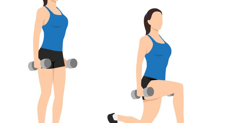 Hold a dumbbell in each hand, and take a big step forward, planting your front foot and lowering your back knee toward the floor. Once your front and back legs are at 90-degree angles, push off your front heel to step back to the starting position, then switch legs for the next rep. Do four sets of 12 to 15 reps per leg.