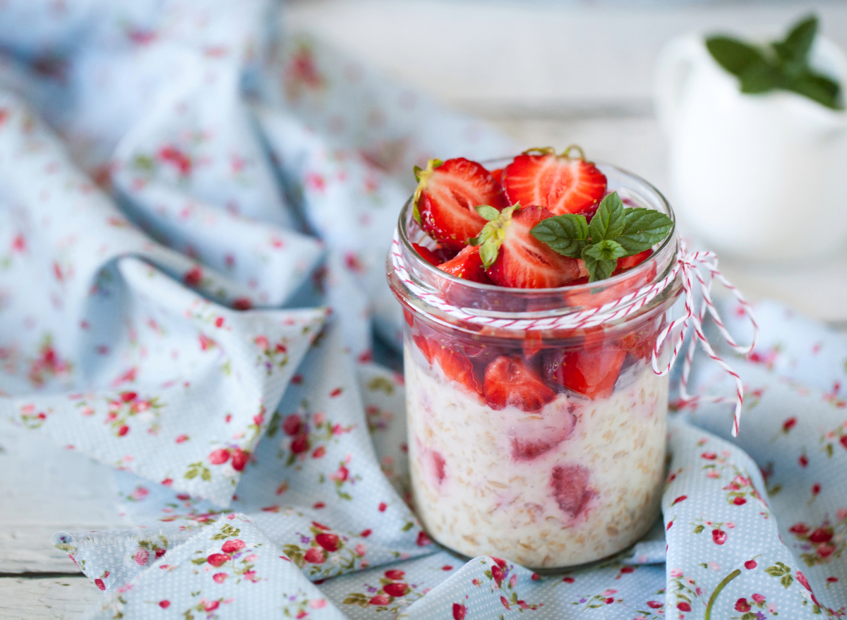 Combine the oats, milk, yogurt, and chia seeds. Mix well, and store the mixture in an air-tight container in the refrigerator overnight. When you are ready to eat, stir in the peanut butter, and top it off with strawberries.