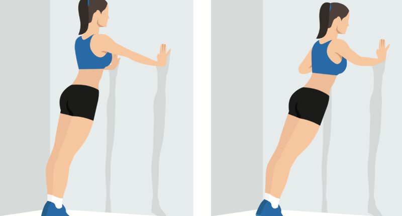 “Using a wall, make sure your elbows form a 90-degree angle when bringing your chest toward the wall. Step farther away from the wall to make them more challenging, and readjust your hands.” Do four sets of 15 to 20 reps.