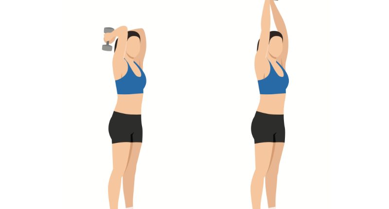To set up for this first exercise, hold one end of a dumbbell with both hands, letting the opposite side hang down. Next, press the dumbbell overhead with your arms extended straight up. Bend your elbows to slowly lower the weight behind your head as far as your range of motion allows. Then, straighten your arms to bring the weight back overhead, and repeat. Aim for three to four sets of 10 to 12 reps.