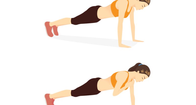 To perform the movement, Furr says, “Get into a high plank position with your hands about shoulder width apart and legs extended out. Make sure you’re staying balanced through your toes and your feet are about hip-width apart. Keeping your abs tight, slowly bend your elbows and lower yourself to the floor until your elbows are at a 90-degree angle. Push yourself back up by pressing through the floor and engaging your chest muscles.” Do three or four sets of eight to 12 reps.